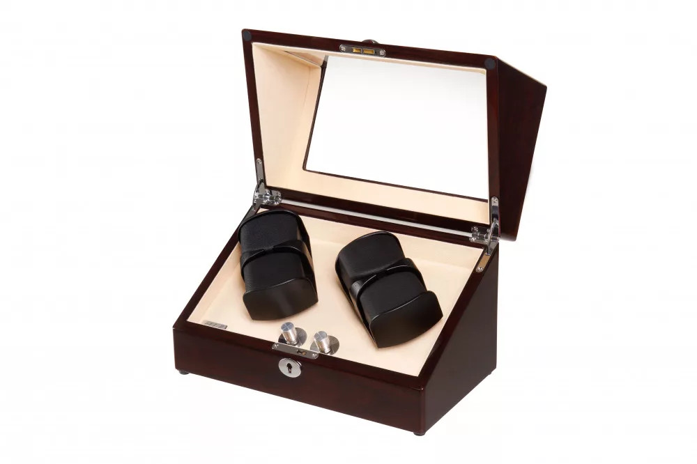 Több rétegben lakkozott mahagóni színű, fából készült óraforgató 4 órához. Kialakításának köszönhetően nagy méretű óráknak is megfelel. Belseje törtfehér színű. A termék hálózatról és elemről egyaránt üzemel. Zárható, kulcs és hálózati adapter tartozék. A bal oldali kettő és a jobb oldali kettő fej együtt irányítható.