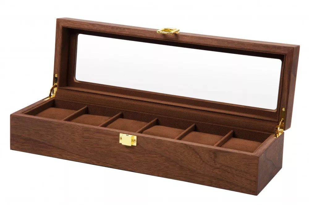 Natúr barna fa óratartó, óradoboz 6 óra számára. Arany színű zsanérok, belseje sötétbarna színű mikroplüss.Külső méretei:Szélesség: 35cmMélység: 12cmMagasság: 9,5cmFakk mérete:Szélesség: 50mm